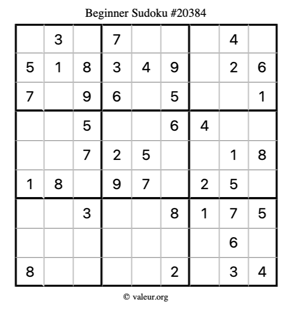 Here is our printable Beginner Sudoku Puzzle #20384. You are welcome to print a copy for yourself and solve it the old-fashioned way with a pencil and an eraser!