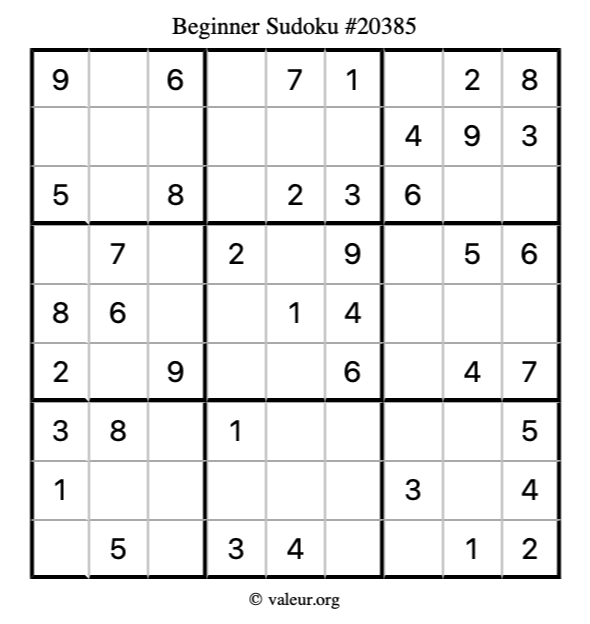 Here is our printable Beginner Sudoku Puzzle #20385. You are welcome to print a copy for yourself and solve it the old-fashioned way with a pencil and an eraser!