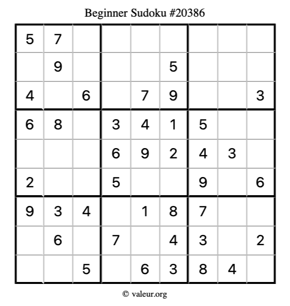 Here is our printable Beginner Sudoku Puzzle #20386. You are welcome to print a copy for yourself and solve it the old-fashioned way with a pencil and an eraser!
