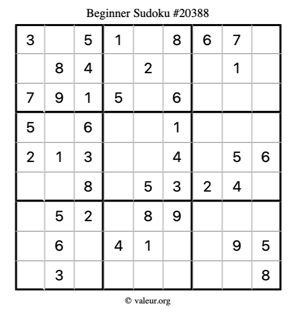 Here is our printable Beginner Sudoku Puzzle #20388. You are welcome to print a copy for yourself and solve it the old-fashioned way with a pencil and an eraser!