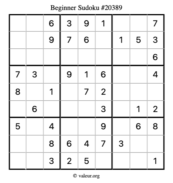 Here is our printable Beginner Sudoku Puzzle #20389. You are welcome to print a copy for yourself and solve it the old-fashioned way with a pencil and an eraser!