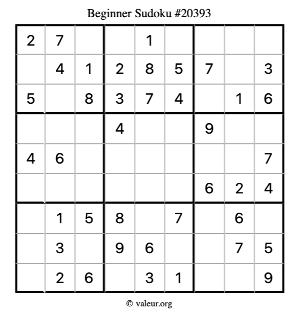 Here is our printable Beginner Sudoku Puzzle #20393. You are welcome to print a copy for yourself and solve it the old-fashioned way with a pencil and an eraser!