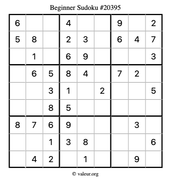 Here is our printable Beginner Sudoku Puzzle #20395. You are welcome to print a copy for yourself and solve it the old-fashioned way with a pencil and an eraser!