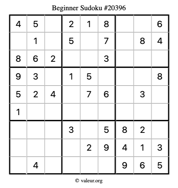 Here is our printable Beginner Sudoku Puzzle #20396. You are welcome to print a copy for yourself and solve it the old-fashioned way with a pencil and an eraser!