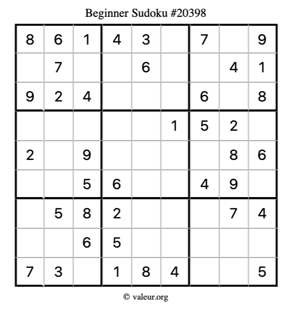 Here is our printable Beginner Sudoku Puzzle #20398. You are welcome to print a copy for yourself and solve it the old-fashioned way with a pencil and an eraser!