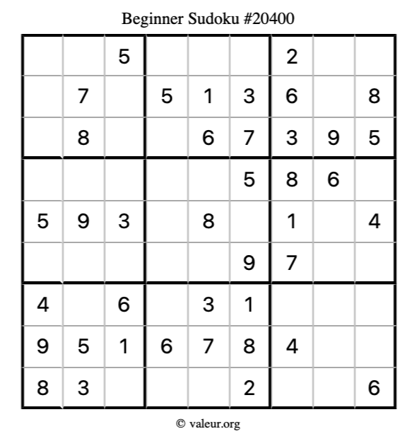 Here is our printable Beginner Sudoku Puzzle #20400. You are welcome to print a copy for yourself and solve it the old-fashioned way with a pencil and an eraser!