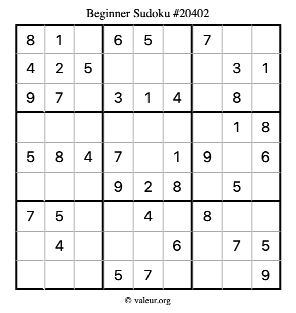 Here is our printable Beginner Sudoku Puzzle #20402. You are welcome to print a copy for yourself and solve it the old-fashioned way with a pencil and an eraser!