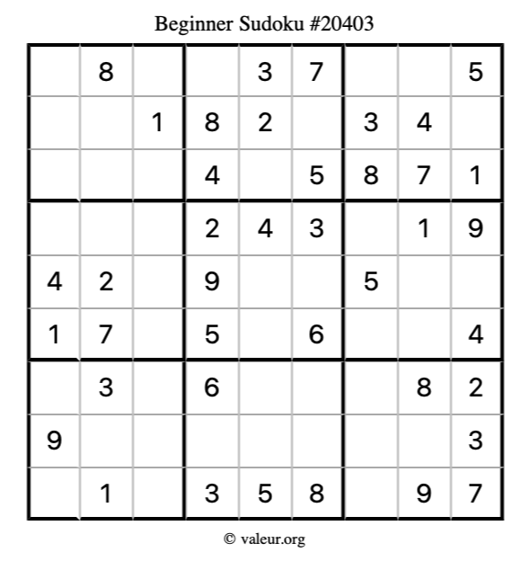 Here is our printable Beginner Sudoku Puzzle #20403. You are welcome to print a copy for yourself and solve it the old-fashioned way with a pencil and an eraser!