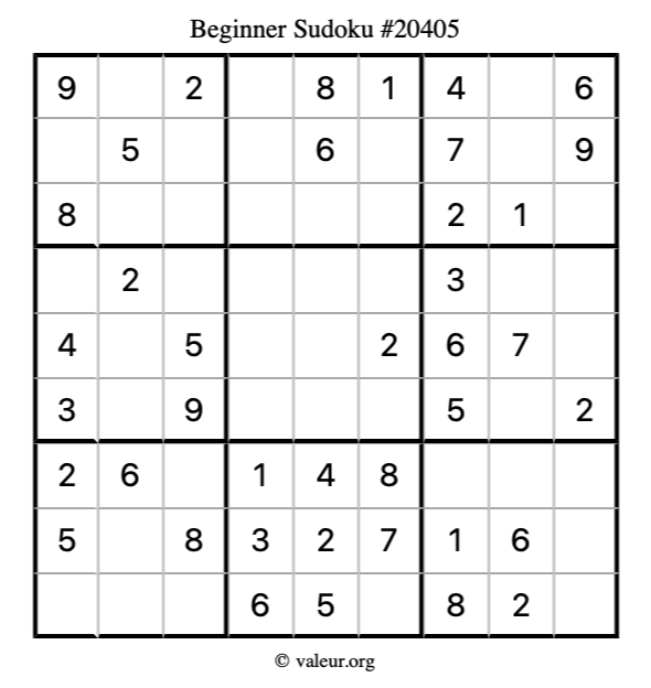 Here is our printable Beginner Sudoku Puzzle #20405. You are welcome to print a copy for yourself and solve it the old-fashioned way with a pencil and an eraser!