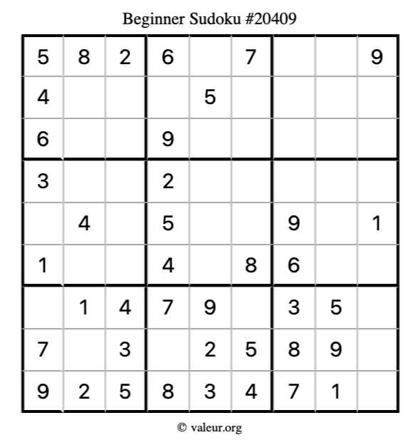 Here is our printable Beginner Sudoku Puzzle #20409. You are welcome to print a copy for yourself and solve it the old-fashioned way with a pencil and an eraser!