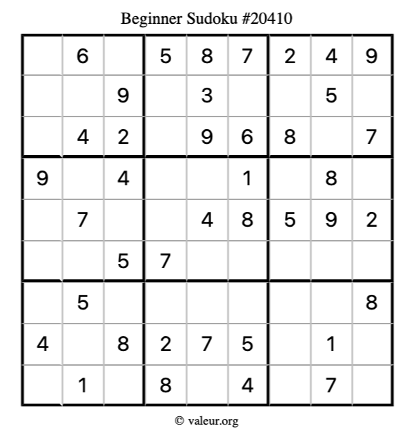 Here is our printable Beginner Sudoku Puzzle #20410. You are welcome to print a copy for yourself and solve it the old-fashioned way with a pencil and an eraser!