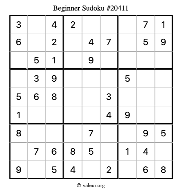 Here is our printable Beginner Sudoku Puzzle #20411. You are welcome to print a copy for yourself and solve it the old-fashioned way with a pencil and an eraser!