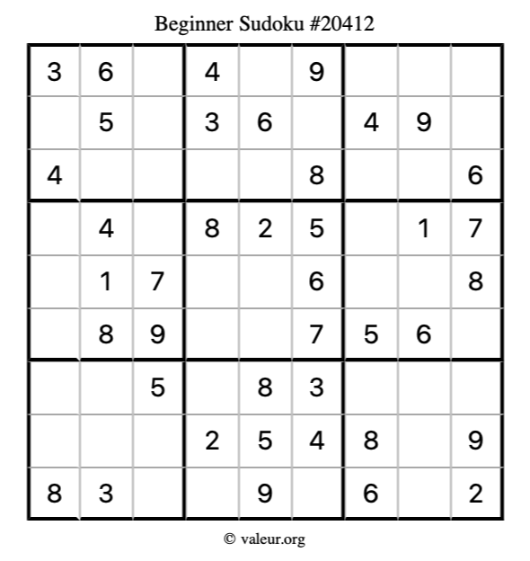 Here is our printable Beginner Sudoku Puzzle #20412. You are welcome to print a copy for yourself and solve it the old-fashioned way with a pencil and an eraser!