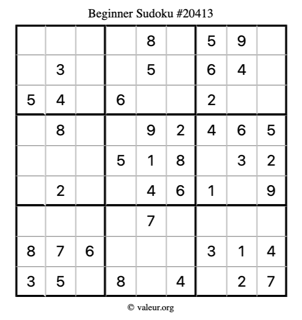 Here is our printable Beginner Sudoku Puzzle #20413. You are welcome to print a copy for yourself and solve it the old-fashioned way with a pencil and an eraser!