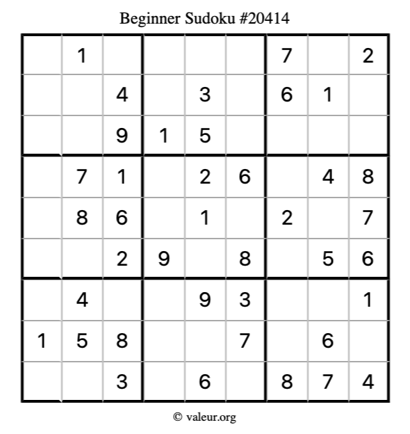 Here is our printable Beginner Sudoku Puzzle #20414. You are welcome to print a copy for yourself and solve it the old-fashioned way with a pencil and an eraser!
