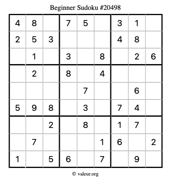 Here is our printable Beginner Sudoku Puzzle #20498. You are welcome to print a copy for yourself and solve it the old-fashioned way with a pencil and an eraser!