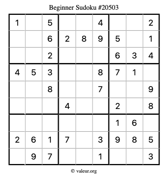 Here is our printable Beginner Sudoku Puzzle #20503. You are welcome to print a copy for yourself and solve it the old-fashioned way with a pencil and an eraser!