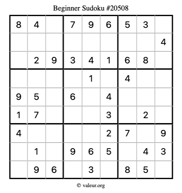 Here is our printable Beginner Sudoku Puzzle #20508. You are welcome to print a copy for yourself and solve it the old-fashioned way with a pencil and an eraser!