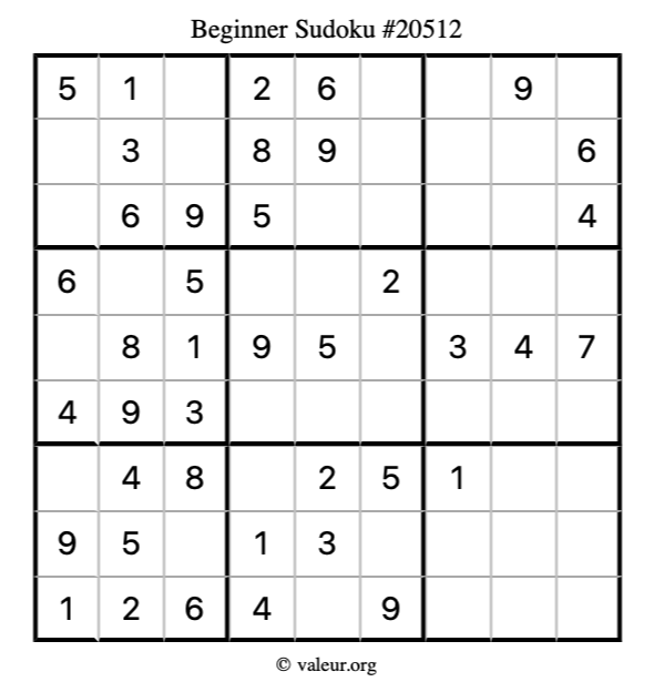Here is our printable Beginner Sudoku Puzzle #20512. You are welcome to print a copy for yourself and solve it the old-fashioned way with a pencil and an eraser!