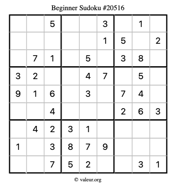 Here is our printable Beginner Sudoku Puzzle #20516. You are welcome to print a copy for yourself and solve it the old-fashioned way with a pencil and an eraser!