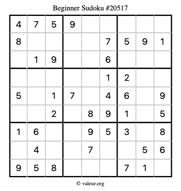 Here is our printable Beginner Sudoku Puzzle #20517. You are welcome to print a copy for yourself and solve it the old-fashioned way with a pencil and an eraser!