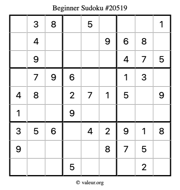Here is our printable Beginner Sudoku Puzzle #20519. You are welcome to print a copy for yourself and solve it the old-fashioned way with a pencil and an eraser!