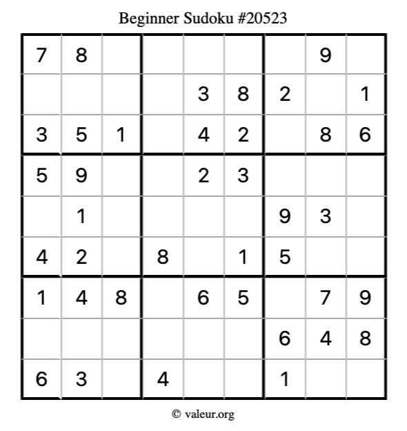 Here is our printable Beginner Sudoku Puzzle #20523. You are welcome to print a copy for yourself and solve it the old-fashioned way with a pencil and an eraser!