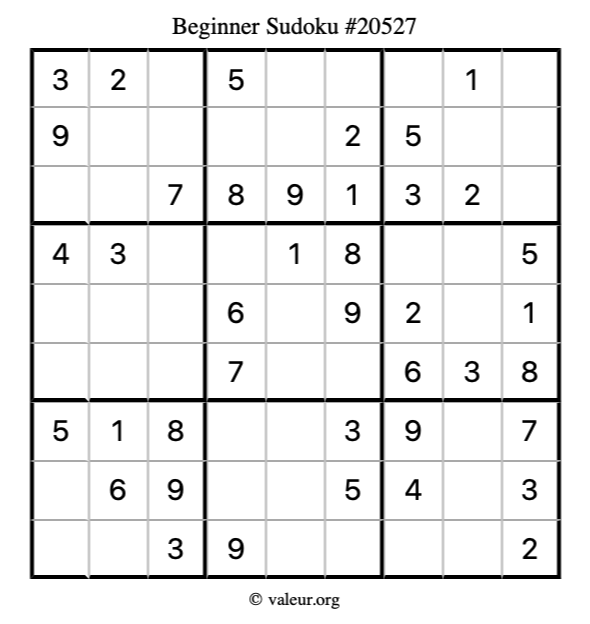 Here is our printable Beginner Sudoku Puzzle #20527. You are welcome to print a copy for yourself and solve it the old-fashioned way with a pencil and an eraser!
