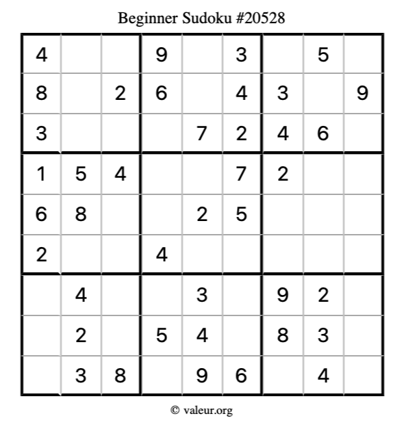 Here is our printable Beginner Sudoku Puzzle #20528. You are welcome to print a copy for yourself and solve it the old-fashioned way with a pencil and an eraser!