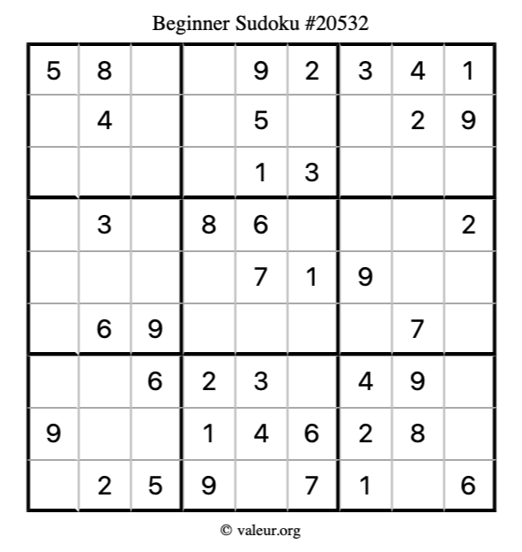 Here is our printable Beginner Sudoku Puzzle #20532. You are welcome to print a copy for yourself and solve it the old-fashioned way with a pencil and an eraser!