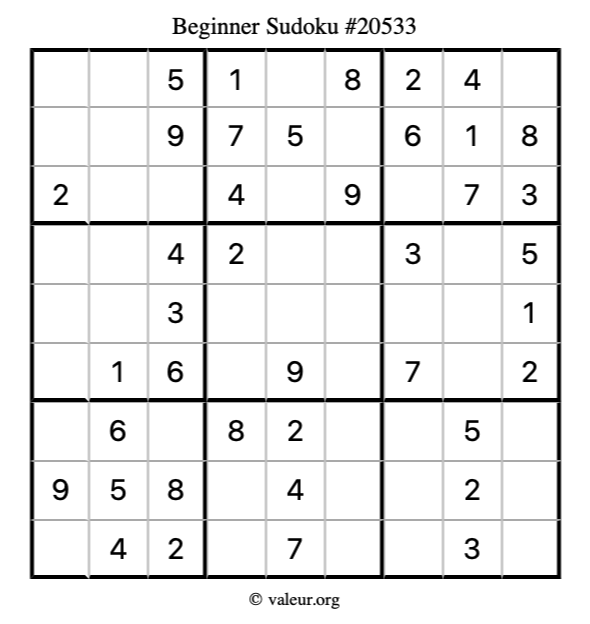 Here is our printable Beginner Sudoku Puzzle #20533. You are welcome to print a copy for yourself and solve it the old-fashioned way with a pencil and an eraser!