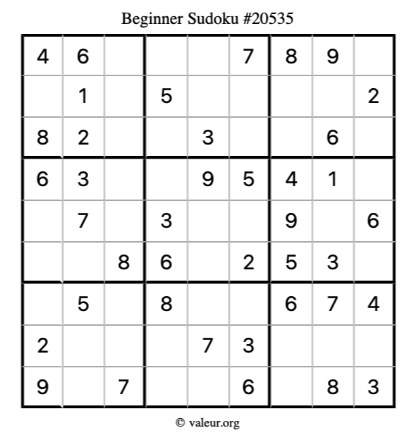 Here is our printable Beginner Sudoku Puzzle #20535. You are welcome to print a copy for yourself and solve it the old-fashioned way with a pencil and an eraser!