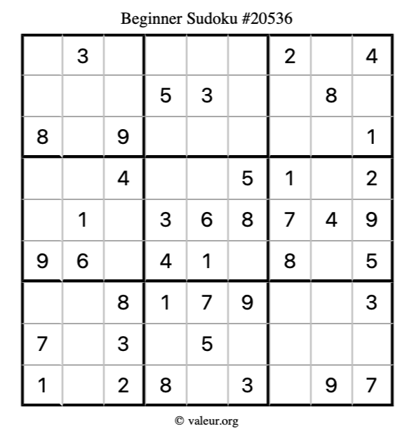 Here is our printable Beginner Sudoku Puzzle #20536. You are welcome to print a copy for yourself and solve it the old-fashioned way with a pencil and an eraser!