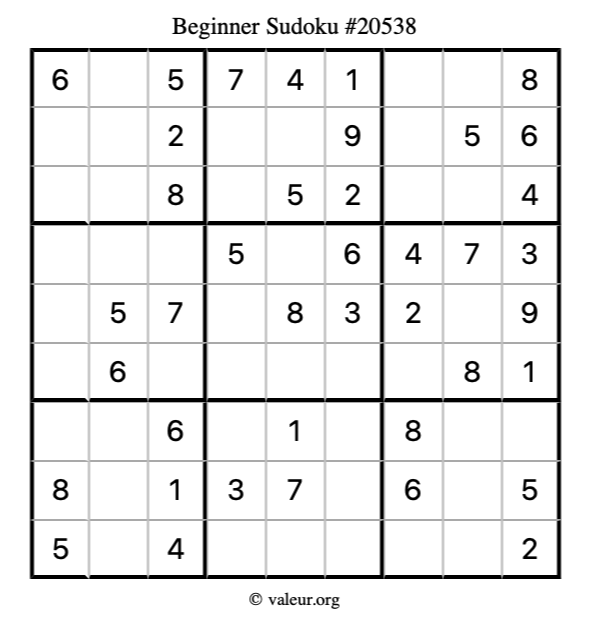 Here is our printable Beginner Sudoku Puzzle #20538. You are welcome to print a copy for yourself and solve it the old-fashioned way with a pencil and an eraser!