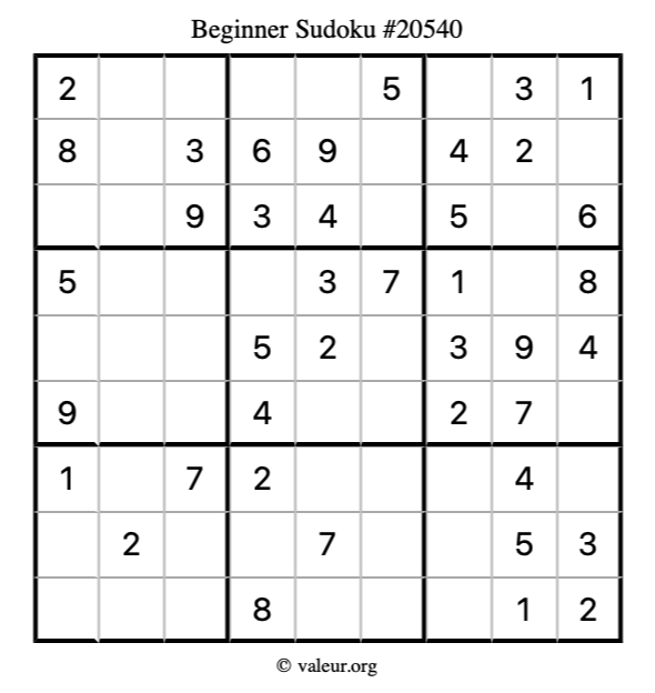 Here is our printable Beginner Sudoku Puzzle #20540. You are welcome to print a copy for yourself and solve it the old-fashioned way with a pencil and an eraser!