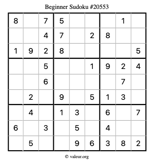 Here is our printable Beginner Sudoku Puzzle #20553. You are welcome to print a copy for yourself and solve it the old-fashioned way with a pencil and an eraser!
