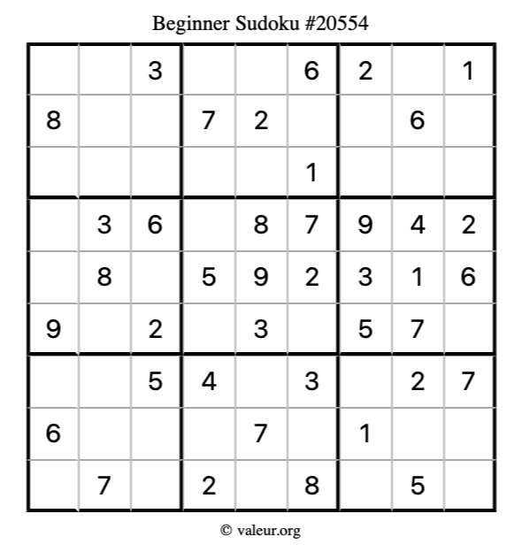 Here is our printable Beginner Sudoku Puzzle #20554. You are welcome to print a copy for yourself and solve it the old-fashioned way with a pencil and an eraser!