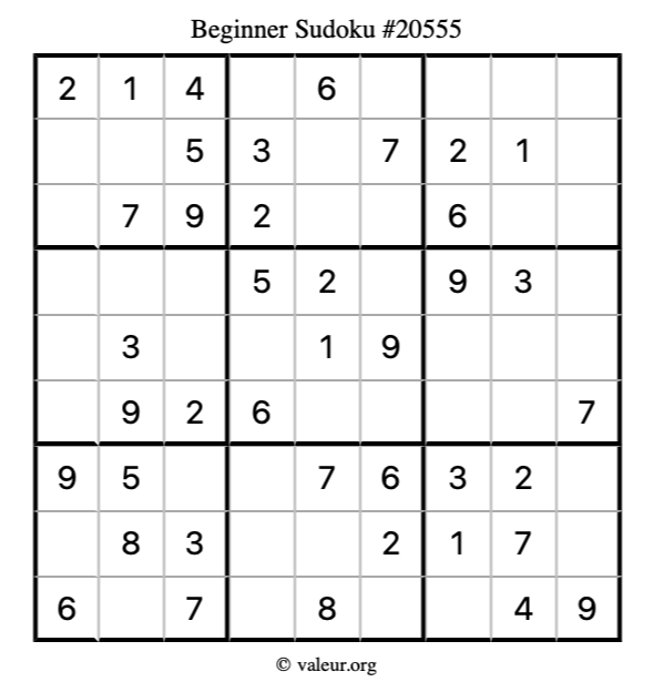 Here is our printable Beginner Sudoku Puzzle #20555. You are welcome to print a copy for yourself and solve it the old-fashioned way with a pencil and an eraser!