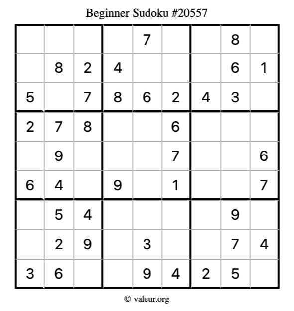 Here is our printable Beginner Sudoku Puzzle #20557. You are welcome to print a copy for yourself and solve it the old-fashioned way with a pencil and an eraser!