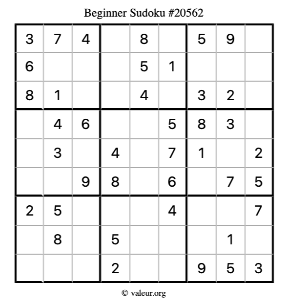 Here is our printable Beginner Sudoku Puzzle #20562. You are welcome to print a copy for yourself and solve it the old-fashioned way with a pencil and an eraser!