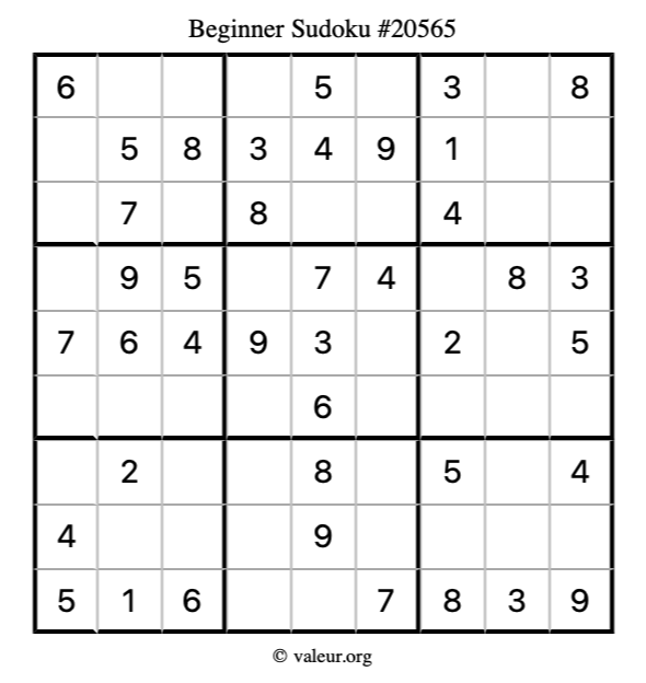 Here is our printable Beginner Sudoku Puzzle #20565. You are welcome to print a copy for yourself and solve it the old-fashioned way with a pencil and an eraser!