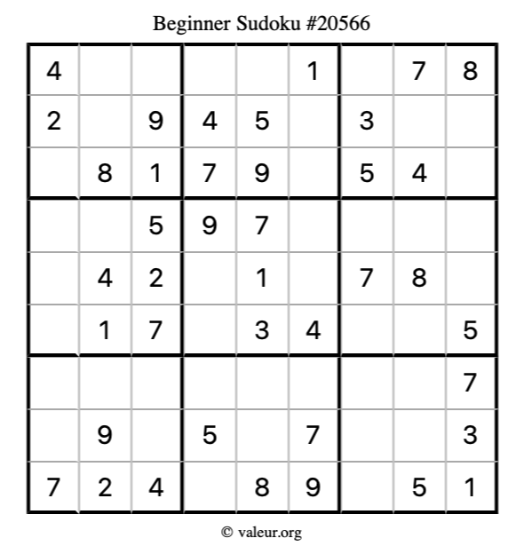 Here is our printable Beginner Sudoku Puzzle #20566. You are welcome to print a copy for yourself and solve it the old-fashioned way with a pencil and an eraser!