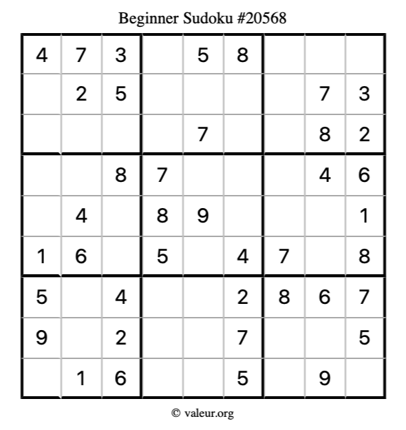 Here is our printable Beginner Sudoku Puzzle #20568. You are welcome to print a copy for yourself and solve it the old-fashioned way with a pencil and an eraser!