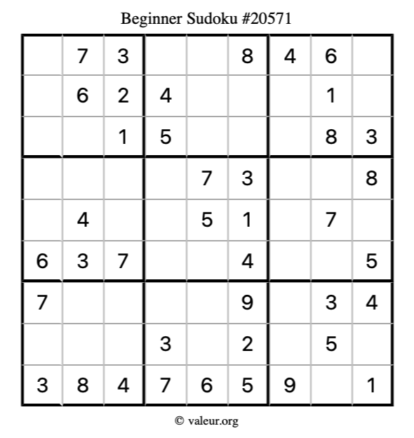 Here is our printable Beginner Sudoku Puzzle #20571. You are welcome to print a copy for yourself and solve it the old-fashioned way with a pencil and an eraser!