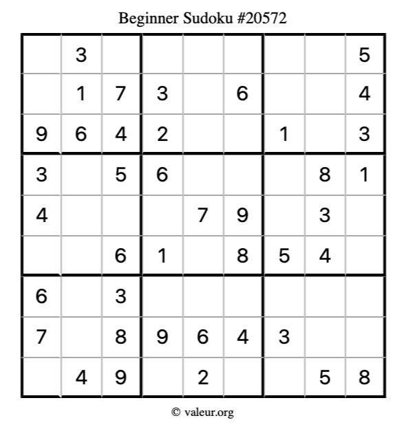 Here is our printable Beginner Sudoku Puzzle #20572. You are welcome to print a copy for yourself and solve it the old-fashioned way with a pencil and an eraser!