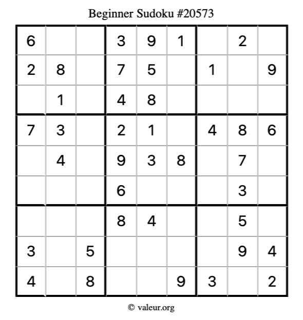 Here is our printable Beginner Sudoku Puzzle #20573. You are welcome to print a copy for yourself and solve it the old-fashioned way with a pencil and an eraser!