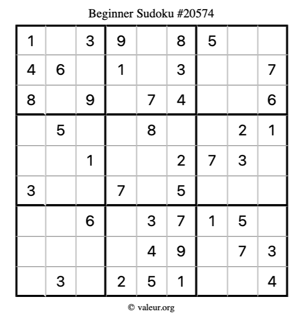 Here is our printable Beginner Sudoku Puzzle #20574. You are welcome to print a copy for yourself and solve it the old-fashioned way with a pencil and an eraser!