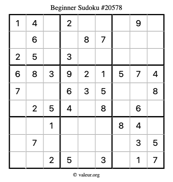 Here is our printable Beginner Sudoku Puzzle #20578. You are welcome to print a copy for yourself and solve it the old-fashioned way with a pencil and an eraser!