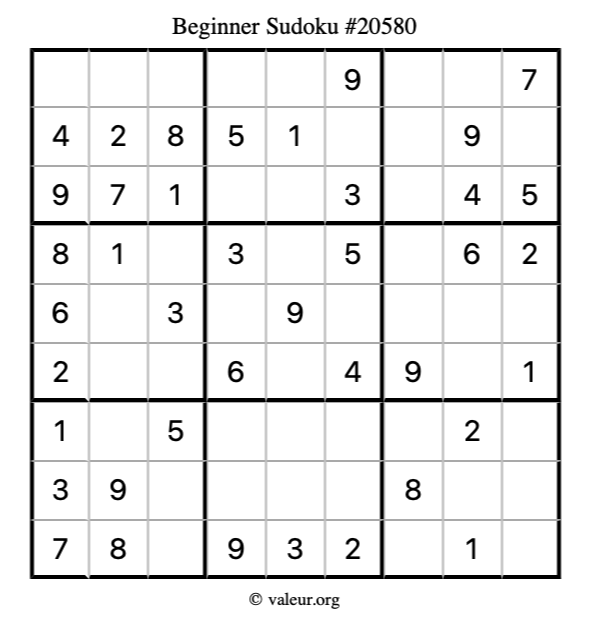 Here is our printable Beginner Sudoku Puzzle #20580. You are welcome to print a copy for yourself and solve it the old-fashioned way with a pencil and an eraser!