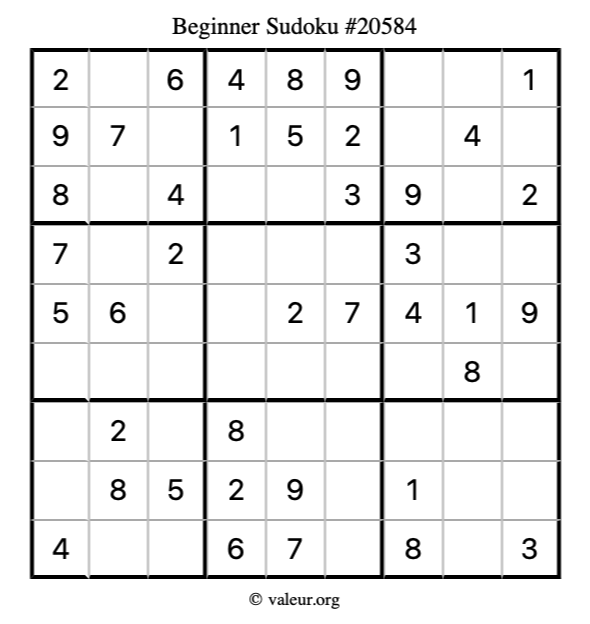 Here is our printable Beginner Sudoku Puzzle #20584. You are welcome to print a copy for yourself and solve it the old-fashioned way with a pencil and an eraser!